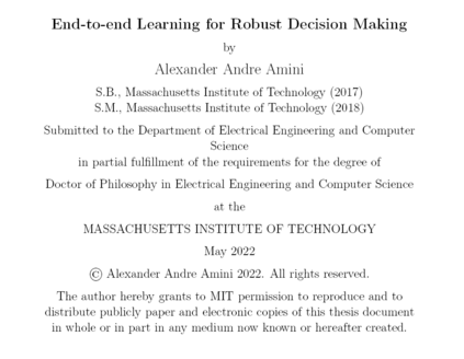在本论文中,我们开发了新的基于学习的方法,以实现自主系统的动态、弹性和稳健决策。通过解决在所有阶段出现的关键挑战,从用于训练的数据,到在这些数据上学习的模型,再到算法,以可靠地适应部署期间的意外事件,来推进野外的鲁棒决策。我们首先探索如何通过计算设计丰富的合成环境,能够模拟连续的难以收集的、分布外的边缘情况,在训练和评估期间易于使用。利用这个丰富的数据基础,我们随后创建了高效、富有表现力的学习模型,以及优化其表示的必要算法,并克服了代表性不足和具有挑战性的数据中的不平衡。最后,使用经过训练的模型,我们将转向部署设置,在该设置中,我们仍然应该预期我们的系统将面临在训练中从未遇到过的全新场景。为此,我们开发了自适应和不确定性感知算法来估计模型的不确定性,并利用它的存在来实现一般化的决策,即使是在存在意外事件的情况下。