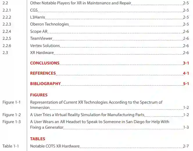 研发人员开发头戴显示装置原型机以辅助军事机修人员执行装甲车辆维护任务。该设备通过提供文本、标签等可视化指引引导用户完成复杂操作流程。为验证装置效能,研究人员在机修人员使用该设备作业时开展专项研究,发现使用原型机人员操作效率显著提升,机修人员评价该技术"在执行测试任务序列时兼具直观性与满意度"。此案例仅是扩展现实(XR)融入现有维修流程以提升效能的范例之一。作为新兴技术,XR在国防部各机构具有广泛适用场景。XR已被公认为变革性力量,能重塑用户与物理/数字元素的交互方式。随着技术成熟度提升,XR软件将在国防部作业体系中日益关键,尤其在维修训练领域。本报告概述XR技术现状,研判其在维修训练领域的当前及未来应用价值,并聚焦国防部特定需求,梳理XR维修训练领域核心机构的现状。