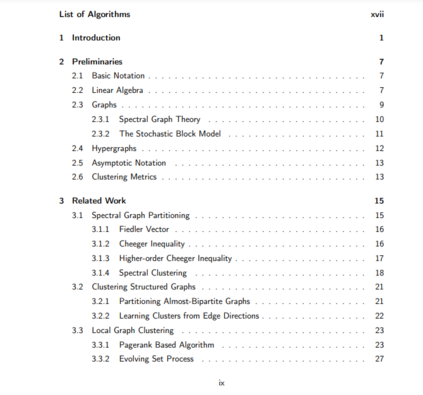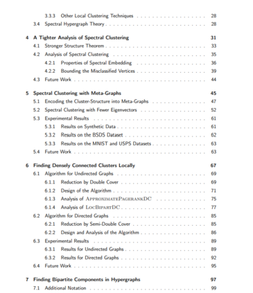 论文的第二部分在前一部分的理论保证的基础上,表明当底层图的簇具有一定的结构时,少于k个特征向量的谱聚类能够比使用k个特征向量的经典谱聚类产生更好的输出,其中k是聚类的个数。本文首次讨论和分析了少于k个特征向量的谱聚类的性能,并表明一般的聚类结构可以用谱方法学习。第三部分考虑使用局部算法高效地学习簇结构,其运行时间仅依赖于目标簇的大小,且与底层输入图无关。经典的局部聚类算法的目标是找到一个与图其他部分稀疏连接的簇,本文的这一部分提出了一种局部聚类算法,它可以找到一对彼此紧密连接的簇。这一结果表明,即使在现实世界中普遍存在的大图中,某些聚类结构也可以在局部环境中有效地学习。