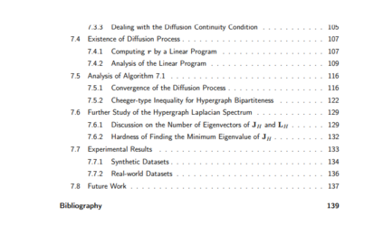 论文的最后研究了超图中密集连接聚类的学习问题。该算法基于一种新的热扩散过程,扩展了最近在超图谱理论方面的一系列工作。它允许在建模对象的高阶关系的数据集中学习簇的结构,可以应用于有效分析在实践中发生的许多复杂数据集。在不同领域的合成数据集和真实数据集上进行了广泛的评估,包括图像分类和分割、迁移网络、合著网络和自然语言处理。实验结果表明,新提出的算法是实用、有效的,可以立即应用于实际数据的聚类结构学习。