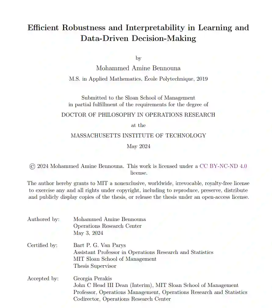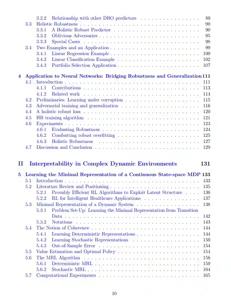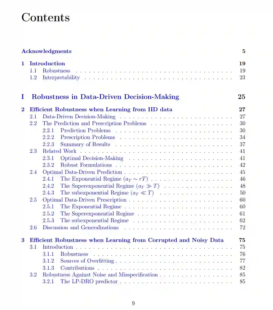 随着机器学习算法在高风险应用中不断开发和部署,确保其可靠性已变得至关重要。本论文介绍了在机器学习中提高可靠性的算法进展,重点强调两个关键维度:鲁棒性和可解释性。 本论文的第一部分侧重于鲁棒性,即保证算法在各种数据不确定性下仍能提供稳定和可预测的性能。我们研究了在不同数据不确定性来源下的学习鲁棒性,包括基本的统计误差以及数据噪声和损坏。我们的研究揭示了这些不同来源如何相互作用并对数据驱动决策产生影响。我们引入了针对特定不确定性来源量身定制的新颖的分布鲁棒优化方法。我们的研究结果表明,对一种来源的保护可能会增加对另一种来源的脆弱性。为了解决这个问题,我们开发了分布模糊集,能够同时提供对所有来源的整体鲁棒性。在每种情况下,我们证明了我们的新方法实现了“高效”的鲁棒性,在平均性能与样本外保证之间实现了最佳平衡。我们的新算法被应用于各种场景,包括训练鲁棒神经网络,在这些场景中显著优于现有基准。 本论文的第二部分探讨了可解释性,这是高风险环境下决策支持工具的一个关键属性,要求算法能够为其决策提供可理解的解释。我们的工作在这一部分的动机来自于数据驱动的个性化患者治疗——一种越来越受欢迎的机器学习应用。在这个强化学习问题中,可解释性至关重要:医生不能依赖于一个黑箱算法来开具治疗方案。我们在理论上引入了学习连续状态空间动态系统最简洁离散表示的问题。在患者治疗的背景下,这相当于基于患者治疗过程中不断变化的特征来确定治疗组。令人惊讶的是,我们在理论上证明,仅从观察到的历史样本路径数据中就有可能学习到动态系统的最简洁表示。随后,我们开发了一种算法,MRL,能够学习这种简洁的表示,从而增强可解释性和可操作性。