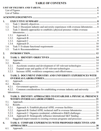 美空军研究实验室(AFRL)的使命是为空中、太空和网络空间部队领导作战技术的发现、开发和交付。为完成这一使命,空军研究实验室需要获得国内外的研发(R&D)和技术人才。美国空军后勤部的国际组合和参与方法很好地利用了国际研发和人才,但仅靠这些方法可能不足以获取越来越多的海外研究成果。为此,美国空军后勤部委托进行了这项研究,以探讨在美国空军后勤部目前的海外办事处(负责考察和资助研发工作)之外,在海外实验室建立强大的实际存在的各种方案。根据这项研究获得的信息,提出了四项主要建议: 2) 扩大、简化和充分利用各种方法,将 AFRL 技术人员嵌入海外实验室;3) 开展国际合作,应对驻地研发挑战;以及 4) 不寻求影响国际科技资金的方法。