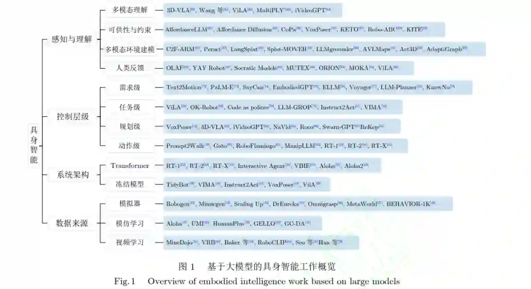 得益于近期拥有世界知识的大规模预训练模型的迅速发展, 基于大模型的具身智能在各类任务中取得了良好的 效果, 展现出了强大的泛化能力与在各领域内广阔的应用前景. 文章对基于大模型的具身智能的工作进行了综述, 首先介绍 了大模型在具身智能系统中起到的感知与理解作用, 其次对大模型在具身智能中参与的需求级、任务级、规划级、动作级四 个级别的控制进行了较为全面的总结, 随后对不同具身智能系统架构进行介绍, 并总结了具目前具身智能模型的数据来源, 包括模拟器、模仿学习以及视频学习, 最后对基于大语言模型的具身智能系统的面临的挑战与发展方向进行讨论与总结.