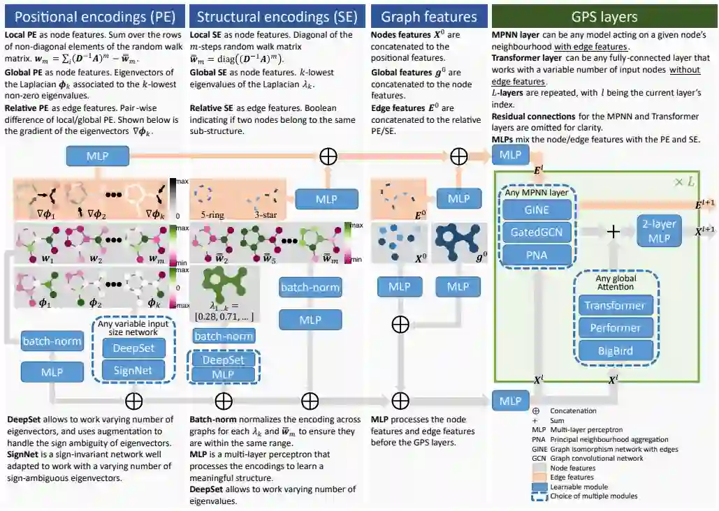 本文首先总结了不同类型的编码,并对其进行了更清晰的定义,将其分为局部编码、全局编码和相对编码。其次,提出了模块化框架GraphGPS,支持多种类型的编码,在小图和大图中提供效率和可伸缩性。框架由位置/结构编码、局部消息传递机制、全局注意机制三个部分组成。该架构在所有基准测试中显示了极具竞争力的结果,展示了模块化和不同策略组合所获得的经验好处。