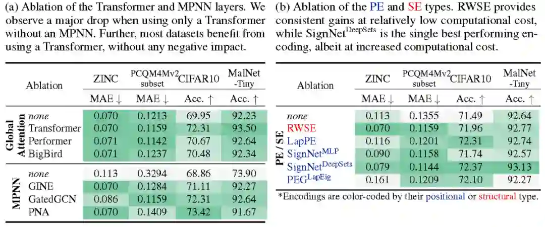 通过消融实验,研究框架中各个结构的作用,可以看到,MPNN和位置/结构编码模块对Transformer的效果均有提升作用。