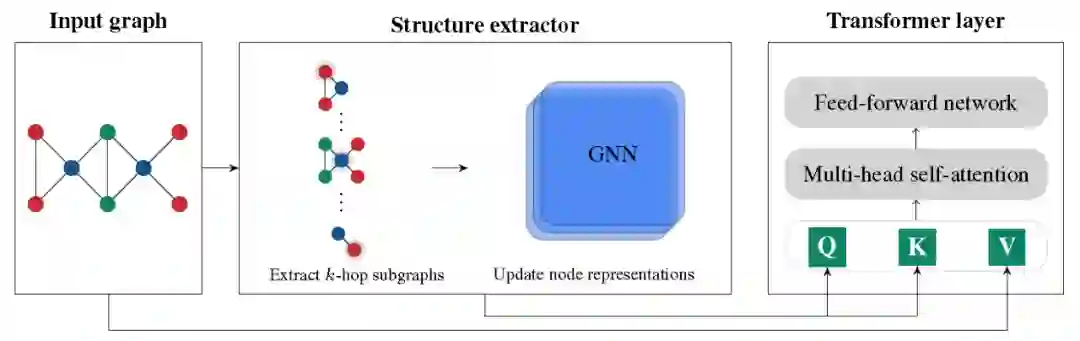 本文提出了一个将图结构编码到注意力机制中的模型。首先,通过Structure extractor抽取节点的子图结构,进行子图结构的注意力计算。其次,遵循Transformer的结构进行计算。