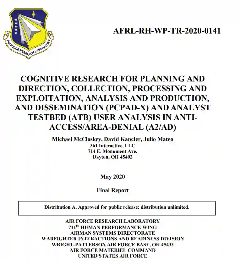 这项工作是为了支持研究在有争议的规划和指导、收集、处理和开发、分析和生产以及传播(PCPAD)环境中的分析任务和备选支持。这项工作包括一系列广泛的目标,从认知数据的收集和分析,到流程和工具的重新设计,再到演习支持,以及在许多工作中持续提供认知和情报分析的专业知识。这些工作确定、建立和保持了整个空军情报、监视和侦察局(AFISR)企业的关键联系,以提高分析员在A2/AD环境中的表现。