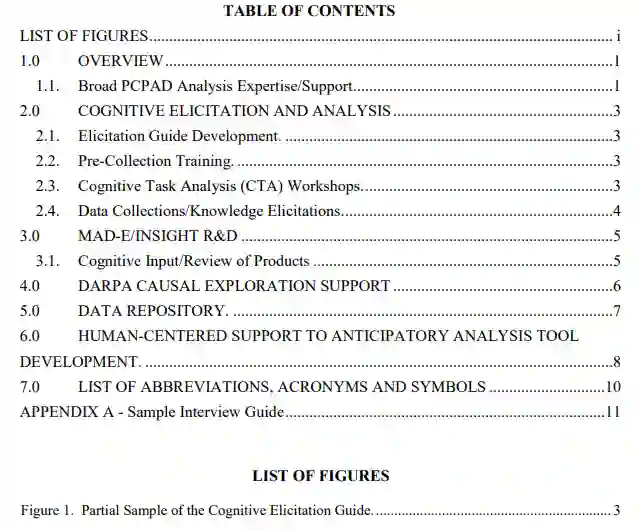 这项工作的主要目标是支持美空军研究实验室(AFRL)711TH人类性能联队(HPW)、空军系统局、作战人员互动和准备处、任务分析处(7llth HPW/RHWA)在有争议的规划和指导、收集、处理和开发、分析和生产以及传播(PCPAD)环境中研究分析任务和候选支持。在此过程中,361互动研究与发展(R&D)研究小组提供了各种形式的支持,涵盖了广泛的目标,包括认知数据的收集和分析、流程和工具的重新设计、演习支持,以及在多项工作中持续提供认知和情报分析的专业知识。此外,该团队还帮助进一步识别、建立和维护整个空军情报、监视和侦察局(AFISR)企业的关键联系,从而使第711HPW/RHW继续了解情报界(IC)这一重要组成部分的现状。这种支持的最终目的是提高分析员在现有和新出现的环境中进行分析时的表现。