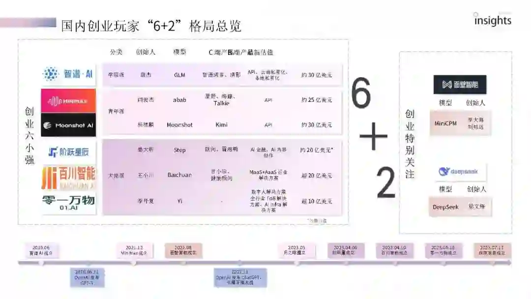 模型 在模型维度上,本章将根据各家创业公司特点有侧重地介绍其研发历程、模型能力特点、架构特色、矩阵构成、Benchmark成绩、AGI路径规划等情况中的一到三项。 应用 在应用维度上,本章将根据各家创业公司特点有侧重地介绍其大模型应用矩阵、特色应用、主力应用、实现功能、用户数据、战略特点、生态布局、付费模式等情况中的一到三项。 融资 在融资维度上,本章将介绍各家创业公司融资历程,具体包括历次融资时间、轮次、金额、估值及投资机构。 团队 在团队维度上,本章将介绍各家创业公司核心团队成员情况,具体包括教育背景、学术影响力、重要头衔、相关工作履历等信息。