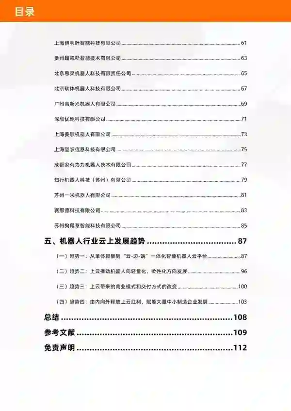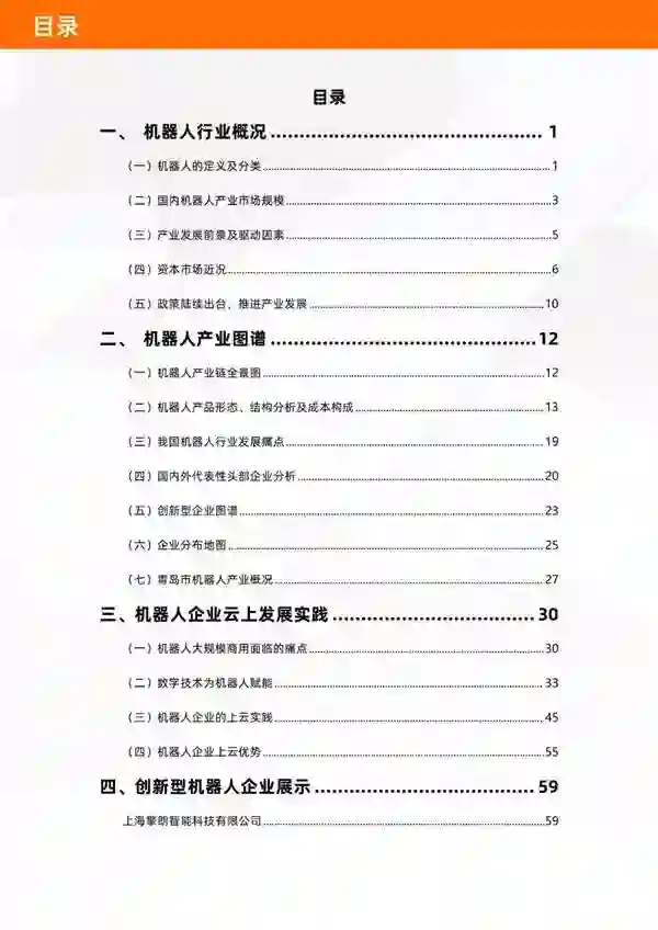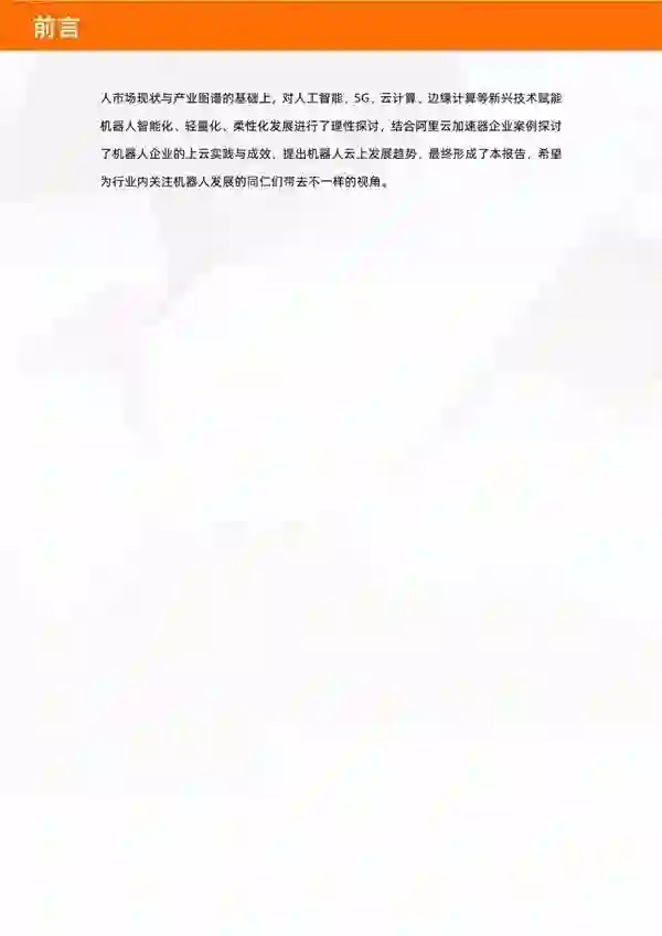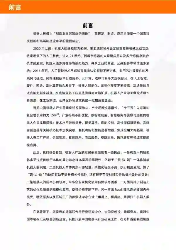 当前中国机器人产业呈现良好发展势头,产业规模快速增长,“十三五”以来年均复合增长率约为15%;产业格局不断优化,以智能制造、智慧服务为使命与愿景的机器人企业竞相涌现;技术水平持续提升,视觉算法、运动控制、高性能伺服驱动、高精密减速器等关键核心技术加快突破,整机功能和性能显著增强;集成应用大幅拓展,机器人在工厂产线、仓储物流、教育娱乐、清洁服务、安防巡检、医疗康复等领域实现规模应用。 然而,机器人产业的发展依然面临着一些挑战:一是机器人的智能化水平过度依赖于本体的算力与小样本学习的局限性,依赖于“云-边-端”一体化智能机器人的突破;二是机器人本体仍然不够轻量,柔性化程度不高,执行精度受限,除了“云-边-端”的协同有助于提升相关性能外,还有赖于可变材料和特殊机构设计的突破;三是机器人的成本仍然较高,中小企业规模化使用仍然较为困难,一方面有赖于制造工艺的优化及场景的规模化应用,使得价格不断下行;另一方面RaaS理念逐步被国内外接受,租赁服务以及区域工厂的探索让中小企业“用得上、用得起、用得好”机器人服务。 在此背景下,阿里云加速器联合行行查研究中心,协同深创投、元璟资本、璞跃中国等机构以及明星创新企业,积极开展中国机器人行业研究工作,在分析当前我国机器人市场现状与产业图谱的基础上,对人工智能、5G、云计算、边缘计算等新兴技术赋能机器人智能化、轻量化、柔性化发展进行了理性探讨,结合阿里云加速器企业案例探讨了机器人企业的上云实践与成效,提出机器人云上发展趋势。 国内机器人产业市场规模