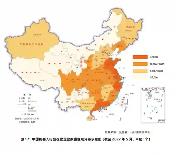 从企业数量的地域分布情况来看,我国机器人企业主要集中在广东、江苏、浙江、山东、上海等经济发达地区。根据企查查数据统计显示,我国34个省级行政区中,拥有0-3000家机器人企业的省级行政区有10个,3000-10000家机器人企业的省级行政区有10个,10000-20000家机器人企业的省级行政区有9个,拥有超20000家机器人企业的省级行政区分别是上海、浙江、山东、江苏以及广东。 具体内容如下
