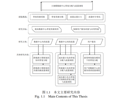 随着互联网和计算机技术的发展,基于互联网提供的各种应用和服务也越来越多了。作为这些应用服务载体的数据中心,其建设需求也在不断增加。然而,在数据中心发展的过程中,还面临着诸多亟待解决的关键科学问题和挑战。本论文主要关注大规模数据中心中带宽资源受限、带宽资源分散、流量总量巨大、流量时空变化这四类挑战,在总结现有方法和研究成果的基础之上,围绕数据中心内的流量、数据中心间的流量、以及用户服务请求这三个研究主体,展开对带宽分配和流量调度这两类问题的研究,具体的研究内容和贡献如下:
