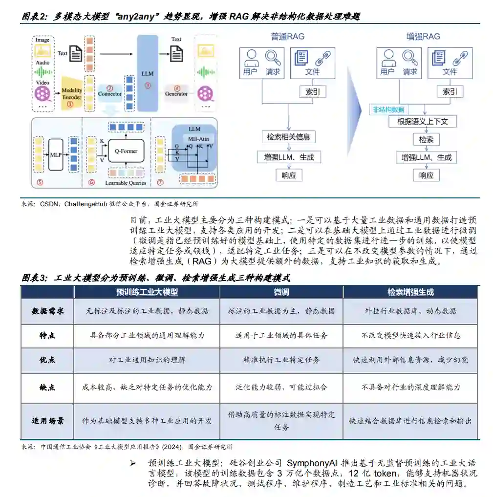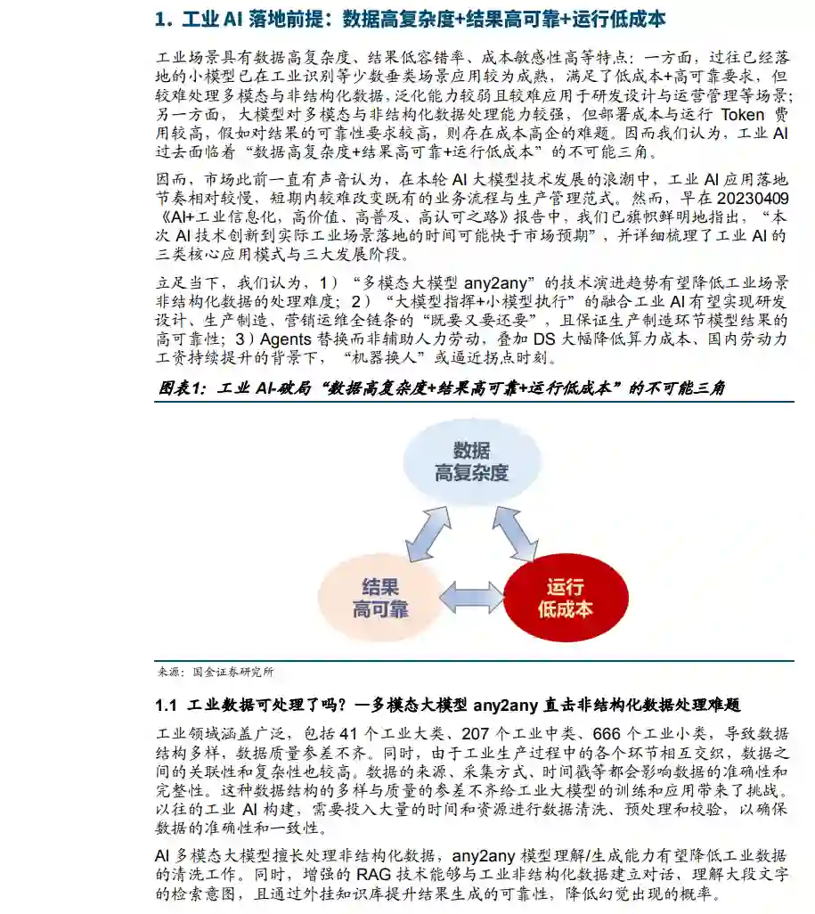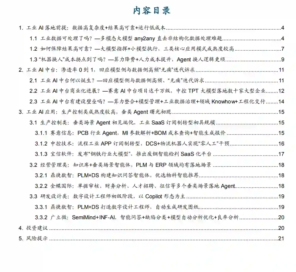 再谈工业AI,当下“易部署、高可靠、低成本”的“既要、又要、还要”或有破局可能。3月6日,Monica.im发布全球首款通用型Agent产品Manus,标志着Agent应用进入全面落地阶段。市场此前一直有声音认为,工业场景具有数据高复杂度、结果低容错率、成本敏感性高等特点,因而在本轮AI大模型技术发展的浪潮中,应用落地节奏相对较慢,短期内较难改变既有的业务流程与生产管理范式。然而,早在20230409《AI+工业信息化,高价值、高普及、高认可之路》报告中,我们已旗帜鲜明地指出,“本次AI技术创新到实际工业场景落地的时间可能快于市场预期”,并详细梳理了工业AI的三类核心应用模式与三大发展阶段。立足当下,我们认为,1)“多模态大模型any2any”的技术演进趋势有望降低工业场景非结构化数据的处理难度;2)“大模型指挥+小模型执行”的融合工业AI中台有望实现跨模型混合推理与模型与知识库的两端的平滑迭代优化;3)Agents替代人力劳动,叠加DS大幅降低算力成本、国内劳动力工资持续提升的背景下,“机器换人”或逼近拐点时刻。 工业AI中台回应模型侧与数据侧高频“无痛”迭代诉求,商业化正处于渗透率0到1阶段。工业客户行业知识库与外界AI大模型迭代速度较快,一方面,AI决策直接影响工业客户生产质量,因而AI必须基于制造业的专业知识进行定制化(预训练、微调、RAG),并伴随客户的知识库变化同步更新;另一方面,过去两年AI大模型迭代加速,且不同的AI模型适配的应用场景有所差异。工业AI中台能够在不影响正常生产经营的前提下实现AI模型两端的平滑升级和优化,具备“开源大模型+云API”混合推理、多模型综合管理、模型全生命周期管理、可观测性四项核心能力。商业化方面,赛意信息近期中标合同金额达4,867万元的AI中台项目,内容包括基于AI工具链实现数据处理、大模型训练与微调、AI应用开发等端到端能力,并具备接入DeepSeek大模型的能力。发布于2024年6月的中控技术流程工业时序大模型TPT,结合大量行业知识和工业数据基础,融合工艺参数的设备异常监测及诊断、实现全过程质量精准模拟与优化控制、将难以机理建模的装置运行优化、帮助石化装置实现精准模拟优化和动态路径规划。目前已在万华化学、兴发集团、镇海炼化等数十家大型企业的氯碱、热电、石化等装置实现落地应用。我们认为,工业AI中台目前尚处于渗透率早期,以“华为晟腾+赛意信息”合作模式为例,工业AI中台部署对算力整合、模型管理、工业数据治理、领域Knowhow、工程化交付等能力提出较高要求。 工业AI应用中生产控制环节成熟度持续保持领先,全环节垂类Agent应用点状涌现。在20230409《AI+工业信息化,高价值、高普及、高认可之路》报告中,我们曾基于信通院《工业智能白皮书(2022)》梳理认为,生产控制环节的AI应用占比超57%,拥有表面缺陷检测、生产过程控制优化、质量关联分析、预测性维护、安全管理与巡检、生产作业视觉识别、物料识别与操作等一批典型细分场景。本篇报告中,我们进一步基于2023年605个工信部智能制造优秀场景统计认为,出现频率排名前10的场景生产环节约占7个,生产制造仍是工业AI落地成熟度最高的环节。究其原因:一是场景需求成效显著,产品质量、效率以及设备管理直接与企业经济挂钩,是几乎所有工业企业共同关注的重点环节。二是数据获得性强,生产过程数据、设备运行过程数据等数据量较大、采集相对简单,为AI技术落地提供了基本条件。三是技术成熟度较高,以机器学习、图像识别等传统AI算法面向特定问题实现识别、参数预测及优化为主。垂类Agent场景中:1)赛意信息AI+PCB方案打通MI参数解析?BOM成本查询?自动生成报价全流程。2)中控技术基于TPT大模型推动流程工业APP订阅制转型,基于DCS+物流机器人实现电解液桶“洗、检、存”“零人工”干预。3)PLM+DS构建知识问答智能体,优选物料智能推荐;打造数字设计工程师,自动生成研发图纸。4)钢铁IT企业发布“钢铁行业大模型”,推出废钢智能检判SaaS化平台。5)基于金蝶云·苍穹开发企业服务智能体,在单据审核、财务分析、人才招聘、征信等多个垂类场景落地Agent。6)EDA企业智能问答+缺陷分类+模型自动分析优化+良率分析。 我们认为,AI大模型问世2年多后再谈工业AI,“易部署、高可靠、低成本”的“不可能三角”或有破局可能,我们看好工业AI中台+垂类Agent应用落地,推荐关注中控技术、赛意信息、中望软件等工业AI重点标的。