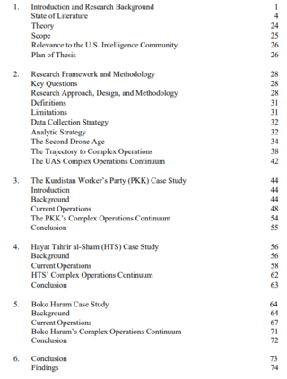 目前的文献认为,恐怖组织未来的无人机系统(UAS)行动威胁有限。本研究的论点恰恰相反。恐怖组织使用无人机系统技术目前只是一种小众威胁。然而,有证据表明,这种威胁将在未来五年内成为主流。本研究采用案例研究法进行定量研究,以证明研究问题。因变量是恐怖分子使用复杂的无人机系统行动。自变量是简单性、供应和规模。研究评估了三个恐怖组织:库尔德工人党、Hayat Tahrir al-Sham 和博科圣地。研究结果表明,获取无人机系统技术很容易,但由于技术限制,扩大行动范围却很困难。此外,报告还指出了当前文献和研究中亟待解决的问题,如组织如何获取上述技术并筹集资金来开发项目。报告还强调了美国和国际社会在应对无人机系统威胁方面取得的进展,同时暴露了立法和法规方面的明显差距。研究的意义表明,美国及其盟国在抵御威胁方面已经落后。
