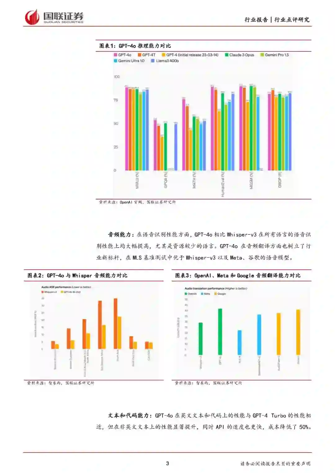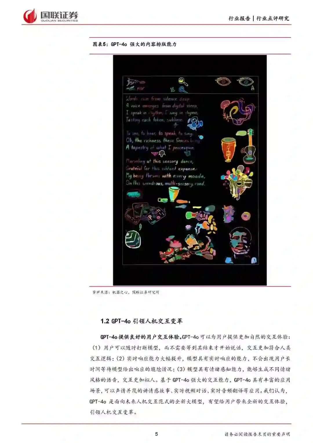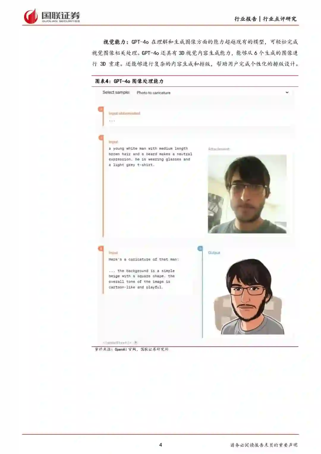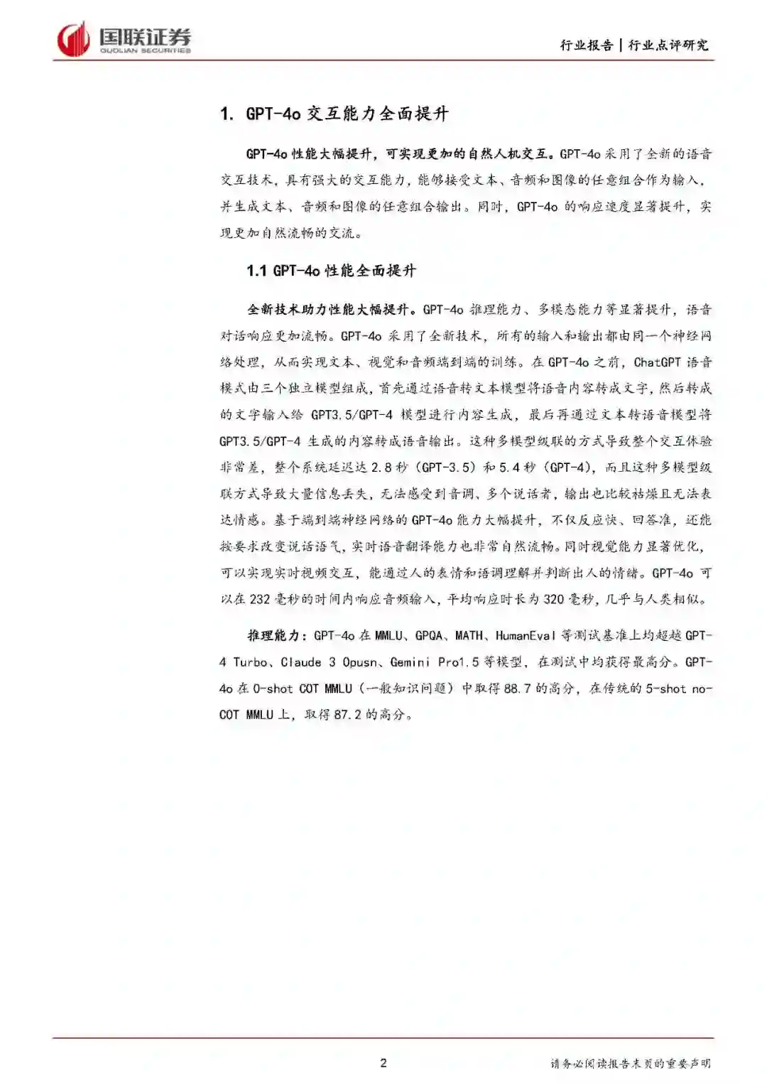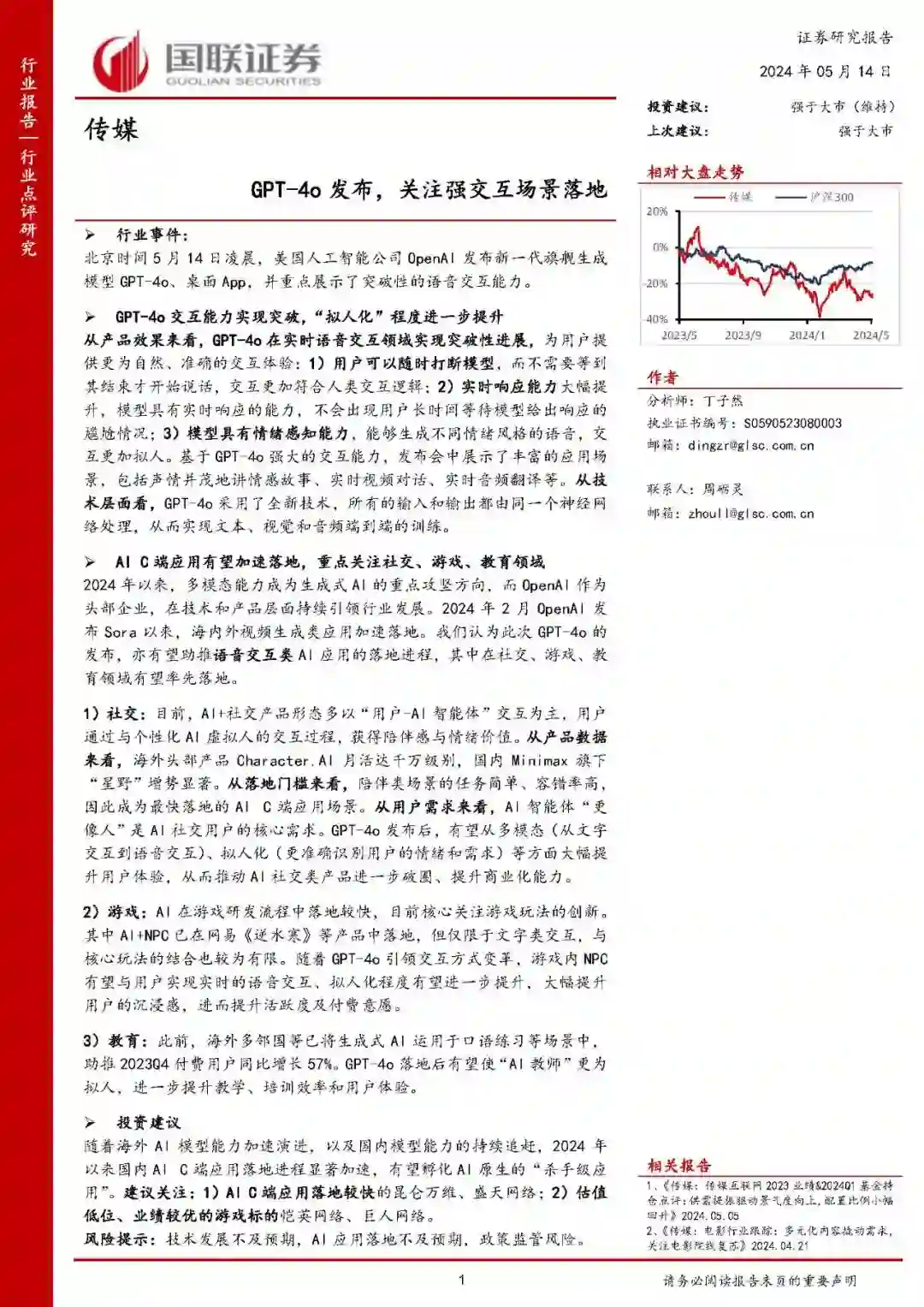 北京时间5月14日凌晨,美国人工智能公司OpenAI发布新一代旗舰生成模型GPT-4o、桌面App,并重点展示了突破性的语音交互能力。 GPT-4o交互能力实现突破,“拟人化”程度进一步提升 从产品效果来看,GPT-4o在实时语音交互领域实现突破性进展,为用户提供更为自然、准确的交互体验:1)用户可以随时打断模型,而不需要等到其结束才开始说话,交互更加符合人类交互逻辑;2)实时响应能力大幅提升,模型具有实时响应的能力,不会出现用户长时间等待模型给出响应的尴尬情况;3)模型具有情绪感知能力,能够生成不同情绪风格的语音,交互更加拟人。基于GPT-4o强大的交互能力,发布会中展示了丰富的应用场景,包括声情并茂地讲情感故事、实时视频对话、实时音频翻译等。从技术层面看,GPT-4o采用了全新技术,所有的输入和输出都由同一个神经网络处理,从而实现文本、视觉和音频端到端的训练。 AI C端应用有望加速落地,重点关注社交、游戏、教育领域2024年以来,多模态能力成为生成式AI的重点攻坚方向,而OpenAI作为头部企业,在技术和产品层面持续引领行业发展。2024年2月OpenAI发布Sora以来,海内外视频生成类应用加速落地。我们认为此次GPT-4o的发布,亦有望助推语音交互类AI应用的落地进程,其中在社交、游戏、教育领域有望率先落地。 1)社交:目前,AI+社交产品形态多以“用户-AI智能体”交互为主,用户通过与个性化AI虚拟人的交互过程,获得陪伴感与情绪价值。从产品数据来看,海外头部产品Character.AI月活达千万级别,国内Minimax旗下“星野”增势显著。从落地门槛来看,陪伴类场景的任务简单、容错率高,因此成为最快落地的AI C端应用场景。从用户需求来看,AI智能体“更像人”是AI社交用户的核心需求。GPT-4o发布后,有望从多模态(从文字交互到语音交互)、拟人化(更准确识别用户的情绪和需求)等方面大幅提升用户体验,从而推动AI社交类产品进一步破圈、提升商业化能力。 2)游戏:AI在游戏研发流程中落地较快,目前核心关注游戏玩法的创新。其中AI+NPC已在网易《逆水寒》等产品中落地,但仅限于文字类交互,与核心玩法的结合也较为有限。随着GPT-4o引领交互方式变革,游戏内NPC有望与用户实现实时的语音交互、拟人化程度有望进一步提升,大幅提升用户的沉浸感,进而提升活跃度及付费意愿。 3)教育:此前,海外多邻国等已将生成式AI运用于口语练习等场景中,助推2023Q4付费用户同比增长57%。GPT-4o落地后有望使“AI教师”更为拟人,进一步提升教学、培训效率和用户体验。
