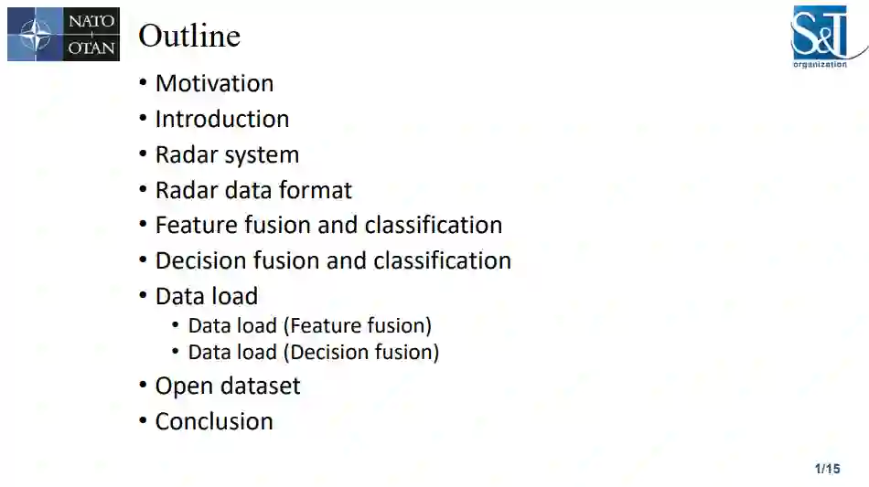 使用空间分布的多个雷达节点,在不受约束的运动方向上研究了连续人类活动的识别,在使用单个节点时,活动可能发生在不利的角度或被遮挡的视角。此外,这种网络不仅有利于实现上述目标,而且也有利于可能需要不止一个传感器的更大的受控监视区域。具体来说,当目标位于长距离和不同角度时,分布式网络可以在节点之间显示出显著的特征差异。雷达数据可以用不同的域来表示,其中人类活动识别(HAR)的一个广为人知的域是微多普勒频谱图。然而,其他域可能更适合于更好的分类性能,或对计算资源有限的低成本硬件更有优势,如范围-时间或范围-多普勒域。一个开放的问题是如何利用从上述数据域以及从同时观察监视区域的不同分布式雷达节点中提取信息的多样性。为此,数据融合技术可以在每个雷达节点的数据表示层面以及网络中不同节点之间使用。将利用所介绍的决策融合方法(通常在每个节点上操作一个分类器)或特征融合方法(在使用一个单一的分类器之前对数据进行串联),研究它们在连续序列分类中的性能,这是一种更加自然和现实的人类运动分类方式,同时也考虑到数据集中固有的不平衡。