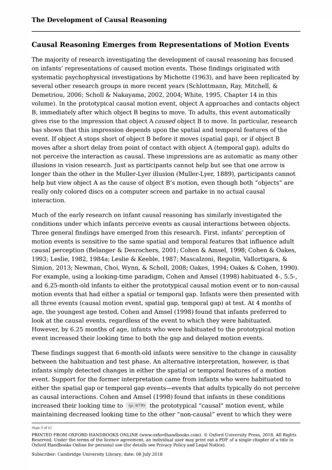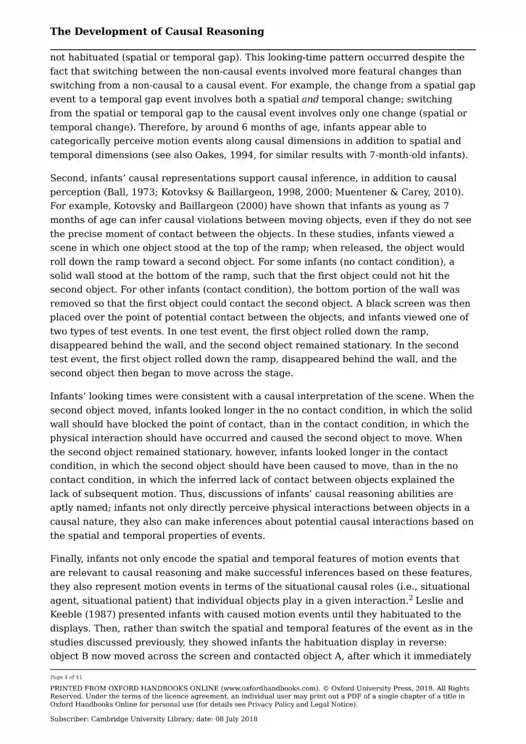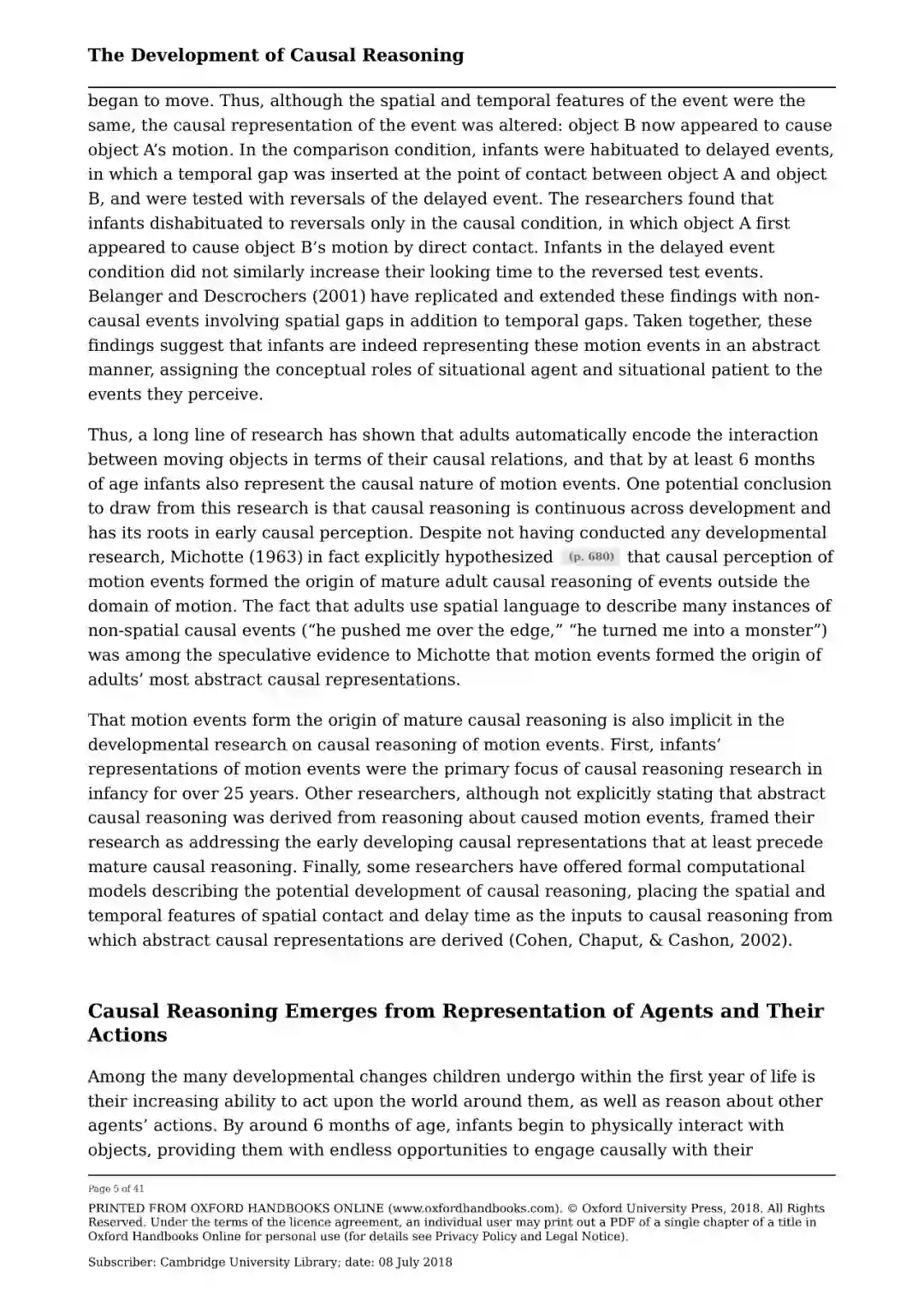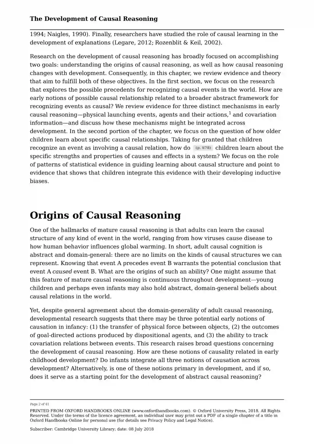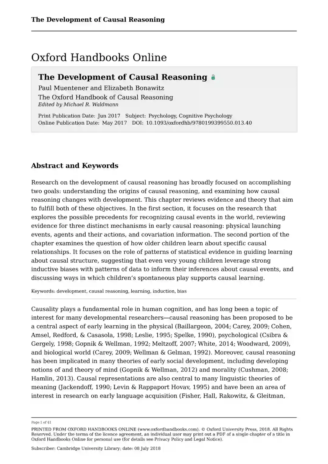 综述摘要 对因果推理发展的研究广泛地集中于实现两个目标: 理解因果推理的起源,以及检验因果推理如何随着发展而变化。本书回顾了旨在实现这两个目标的证据和理论。在第一节中,它着重于探索世界上认识因果事件的可能先例的研究,回顾早期因果推理的三种不同机制的证据:物理启动事件,行动者及其行动,以及共变信息。本书的第二部分考察了年龄稍大的孩子如何了解特定的因果关系的问题。它着重于统计证据的模式在引导学习因果结构方面的作用,表明即使是非常年幼的儿童也利用强烈的数据模式的归纳偏差来提供他们关于因果事件的推论,并讨论儿童的自发游戏如何支持因果学习。
