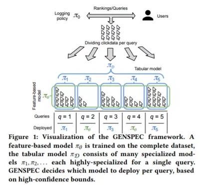 现有的反事实学习排名(LTR)工作集中于优化基于特征的模型,该模型基于文档特征预测最优排名。基于bandit算法的LTR方法通常优化表格模型,这些表格模型记住每个查询的最佳排名。这些类型的模型都有各自的优点和缺点。基于特征的模型在许多查询(包括那些以前未见过的查询)中提供了非常健壮的性能,但是,可用的特征往往限制了模型可以预测的排名。相反,表格模型通过记忆可以收敛于任何可能的排名。然而,记忆非常容易产生噪音,这使得表格模型只有在大量用户交互可用时才可靠。我们能否开发一种稳健的反事实LTR方法,在安全的情况下追求基于记忆的优化? 我们介绍了泛化和专门化(GENSPEC)算法,这是一种鲁棒的基于特征的反事实LTR方法,在安全的情况下,它会对每个查询进行记忆。GENSPEC优化了单个基于特性的模型以实现泛化:跨所有查询的健壮性能,以及用于专门化的许多表模型:每个表模型都针对单个查询优化了高性能。GENSPEC使用新颖的相对高可信度边界来选择每个查询部署哪个模型。通过这样做,GENSPEC成功地实现了专门化表格模型的高性能和基于特征的广义模型的鲁棒性。我们的结果表明,GENSPEC可以在具有足够点击数据的查询上获得最佳性能,而在数据很少或有噪声的查询上具有健壮的行为。