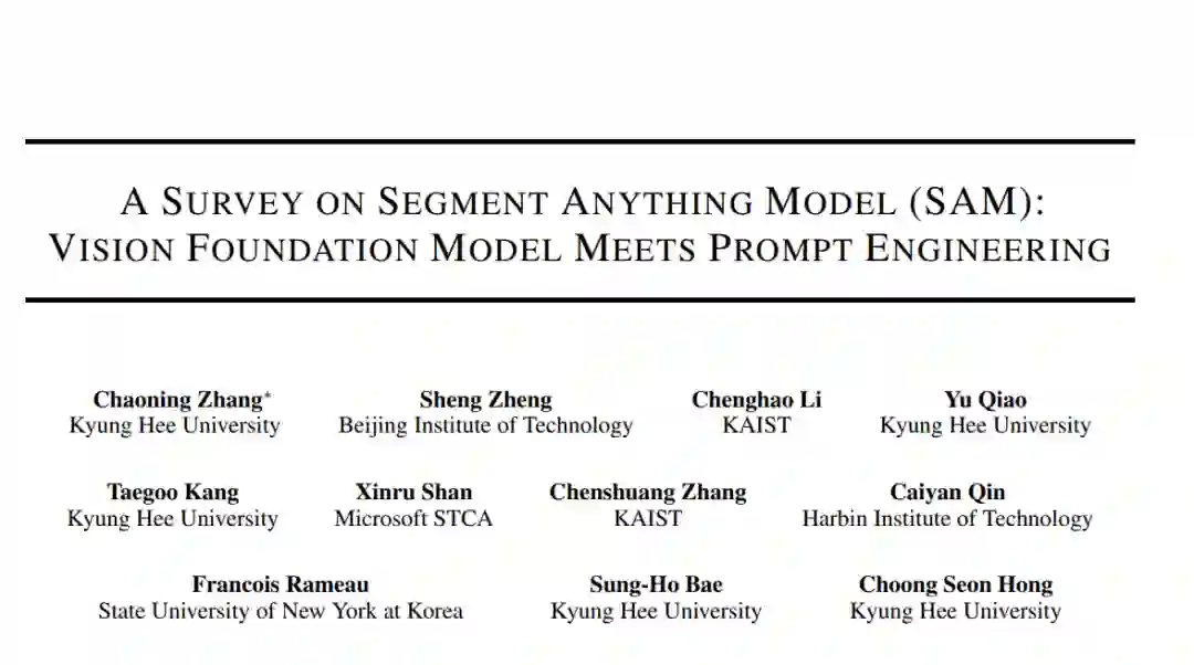 基于可提示的分割任务,"分割任何事物"模型(SAM)是首个模仿人眼理解世界的视觉基础模型,其出现彻底改变了计算机视觉社区。我们的工作进行了对SAM的首次而全面的调研。我们希望我们的调研能帮助对SAM感兴趣并希望进行相关研究的读者。