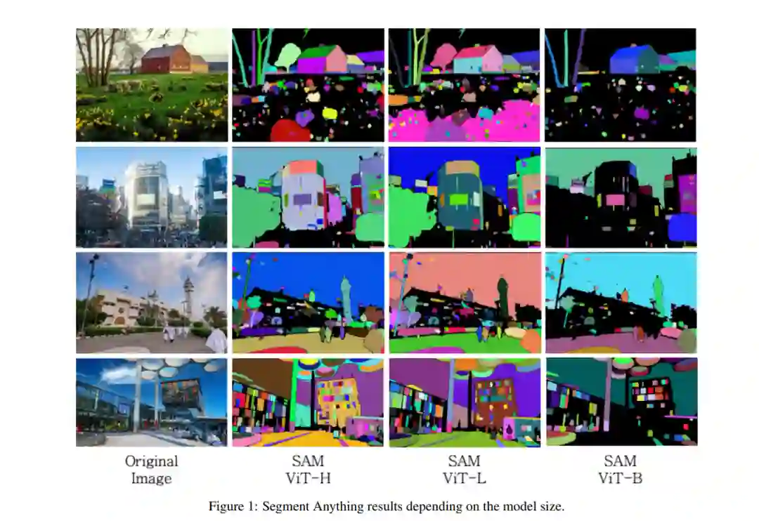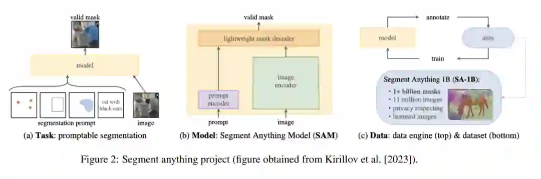 最近,Meta研究团队发布了一个名为"Segment Anything"的项目,其中提出了一个名为Segment Anything Model (SAM)的模型。"Segment Anything"项目的总体视图如图1所示。值得一提的是,SAM执行的是可提示的分割,这与语义分割有两点不同:(1) SAM生成的mask没有标签;(2) SAM依赖于提示。换言之,SAM只是在图像中剪切出物体,而不分配标签(见图1),哪个物体被剪切取决于给定的提示。考虑到所谓的提示工程,SAM在无需微调的情况下展现出了显著的零样本转移性能,使许多人相信,SAM对计算机视觉的影响就如同GPT-3 Brown等人[2020]对自然语言处理的影响一样。SAM在SA-1B上进行训练,该数据集包含来自1100万张图片的超过10亿个mask,是迄今为止发布的最大的分割数据集。