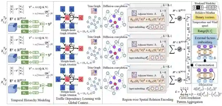 为了实现更加精确的交通流量预测,我们的研究工作设计了一种基于层级图神经网络的深度学习模型, 分别从时间和空间上对不同区域的流量信息进行建模。具体而言, 我们开发的预测模型基于多粒度的Attention机制, 对不同时间粒度上的流量变化的模式进行自动学习。与此同时, 该研究工作对交通流量在空间维度上的变化模式也进行了建模。不同于现有的方法仅仅只考虑局部的空间关系, 我们从整个城市的全局空间范围学习不同区域间的流量变化的关系。通过层级图神经网络的联合建模学习到全局的空间流量的变化模式以及基于地理位置的空间上下文信息。为了验证模型的有效性, 我们在多个公开数据集上进行了实验。实验结果验证了模型相较于现有流量预测算法的优越性,以实现整个城市不同区域更加精确的流量预测结果。
