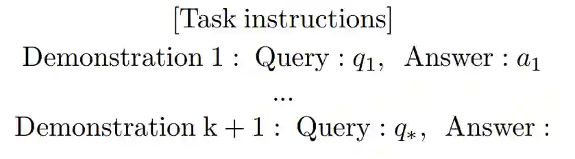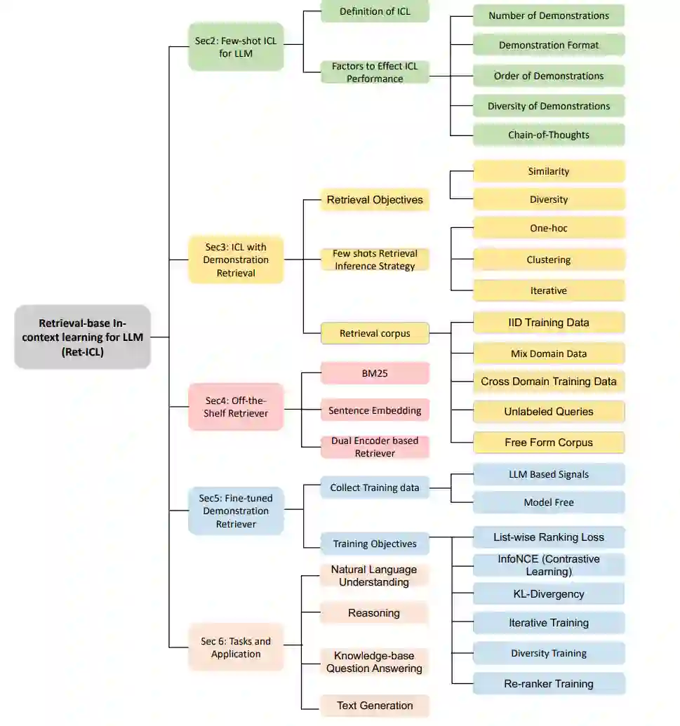 使用检索演示的上下文学习传统上,所有查询都使用相同的少示例演示集,这在查询之间存在高度变化时可能并不理想。另一种方法是检索针对当前查询定制的少示例演示。先前的工作表明,与手工策划或随机选择的演示相比,演示检索在任务指标上带来了显著改进(Luo et al., 2023; Ye et al., 2023a)。此外,当使用检索的演示时,已经证明大型语言模型(LLMs)对于演示顺序等因素(第2.2节)变得不那么敏感(Li et al., 2023)。本节提供了基于检索的上下文学习(RetICL)的概述。我们首先定义了使用检索演示的上下文学习。正式地,给定一个查询q∗和一个检索语料库C,演示检索器DR选择一组演示{d1, . . . , dk} ∼ C,其中每个演示为di = (qi, ai)。大型语言模型(LLM)的输入序列变为(d1, . . . , dk, q∗)。检索器的目标是选择能最大化正确答案a∗概率的演示。RetICL的成功取决于多个因素。本节探讨了设计选择,包括检索目标、检索推理策略和检索语料库。然后在第4节和第5节中,我们探索了检索器模型以及如何训练它们以适应下游任务。