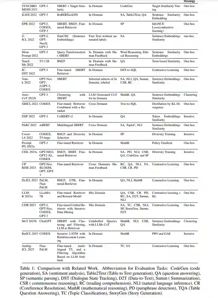 基于检索的ICL(RetICL)在优化语言模型性能方面呈现了一种范式转变,从静态、预定义的示例集转向动态、与上下文敏感的方法。这一创新的核心是自适应示例选择的概念,其中专门的检索器为每个具体任务输入智能地策划定制示例。这种方法不仅一致地优于依赖随机或静态手工制作示例的方法,而且还显示出对多种影响因素的显著抵抗力。RetICL的有效性取决于所选示例的“相关性”和“有用性”,这一过程受到多个因素的复杂影响。这些包括检索器的性质(从通用的现成模型到精细调整的特定领域变体)、检索语料库的来源和多样性、检索器的目标(专注于相似性或多样性)以及集成多个示例的策略。在过去两年中,众多有时并行的研究已经研究了RetICL,每个研究使用不同的术语,并在问题定义和随后的方法论上有所不同,使得理解RetICL的当前研究和实践状态,特别是对于该领域的新手来说,变得困难。在这篇全面的综述中,我们详细分析了RetICL领域的22篇开创性论文(如表1所示),并对其主要构建模块进行了分类(见图1)。我们的工作不仅提供了现有研究的全面综合,而且强调了RetICL在超越以往ICL方法方面的重要领域,并为该领域未来的创新照亮了许多前进的道路,因此成为ICL的关键资源。