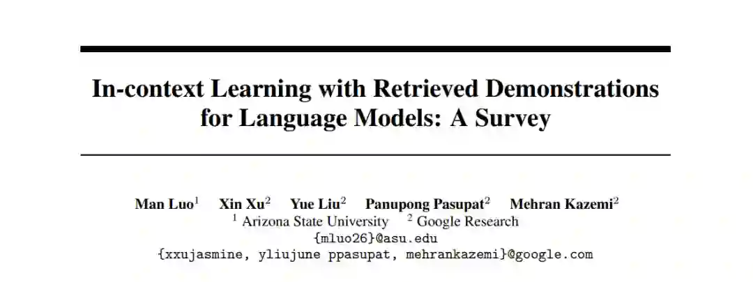 本调查集中讨论了使用检索到的示例进行少样本上下文学习(ICL)的方法,这是检索增强生成(RAG)的关键方面。我们概述了各种检索策略、多样化的检索模型、检索池、训练演示检索器的技术以及应用。基于对当前趋势的全面了解,我们提出了增强这一方法的有效性和功能性的一些有前途的未来发展方向。