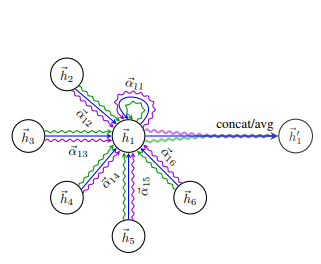 俗话说“一个篱笆三个桩,一个好汉三个帮”,GAT也秉承了这种思想,采用多头注意力机制(multi-head attention)来捕获邻居节点在不同的方面对中心节点影响力的强弱。我们将K 个head分别提取的节点特征表示进行拼接作为最终的节点表示: