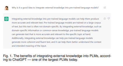 预训练语言模型(PLMs)首先在大型数据集上进行训练,然后直接迁移到下游任务,或在另一个小型数据集上进一步微调,以适应特定的NLP任务。早期的PLMs,如Skip-Gram[1]和GloVe[2],是浅层神经网络,其词嵌入(从窗口大小的上下文中学习)是静态语义向量,这使得它们无法处理动态环境下的一词多义问题。随着深度学习的发展,研究人员试图利用深度神经网络来通过动态语义嵌入来提高任务的性能。起初,人们仍然局限于监督学习的范式,认为没有足够的标记数据,很难释放深度学习的潜力。然而,随着自监督学习的出现,BERT[3]等大型语言模型可以通过预测事先被掩盖的标记,从大规模无标记文本数据中学习大量知识。因此,他们在许多下游NLP任务中取得了突破性进展。此后,许多大型模型开始采用Transformer[4]结构和自监督学习来解决NLP问题,plm逐渐进入快速发展阶段。PLMs最近的惊人成功是OpenAI的ChatGPT。随着研究的进展,人们发现PLMs仍然面临可解释性差、鲁棒性弱和缺乏推理能力的问题。具体来说,PLMs被广泛认为是黑盒,其决策过程是不透明的,因此很难解释。此外,PLMs可能不够鲁棒,因为深度神经模型容易受到对抗性样本的影响。此外,由于纯数据驱动,PLMs的推理能力也受到限制。PLMs的所有这些缺点都可以通过纳入外部知识来改善,这就产生了所谓的知识增强的预训练语言模型(KEPLMs)。图1用ChatGPT的话说就是KEPLMs的优势。