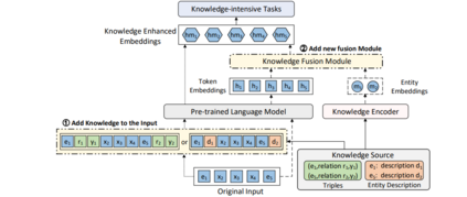 PLMs 显式地合并外部知识主要有三种方式:修改模型输入、添加知识融合模块和利用外部内存。前两种方法将相关知识插入PLMs中,其形式为模型的额外输入或模型中的额外组件,如图7①和②所示。第三种方法使文本空间和知识空间保持独立,从而便于知识更新