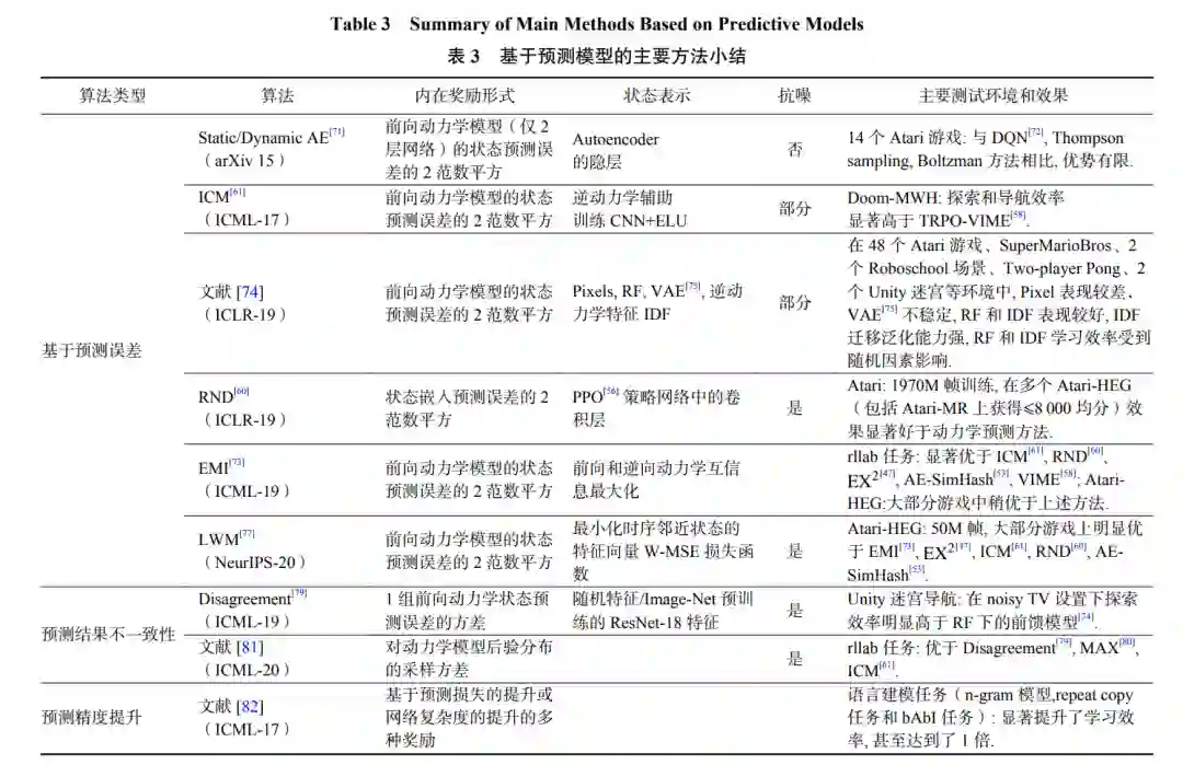 2.4. 基于预测模型的方法 现有大量方法为智能体建立和维护一个对动作 结果和状态转移进行预测的模型, 以模型精度表达 外部环境的不确定性. 以此预测模型为基础, 智能体 根据某些新颖性或可预测性的衡量指标学习价值函 数或策略. 依据产生内在奖励指标的不同, 可以分为 基于预测误差、预测结果不一致性和预测精度提升 的方法.