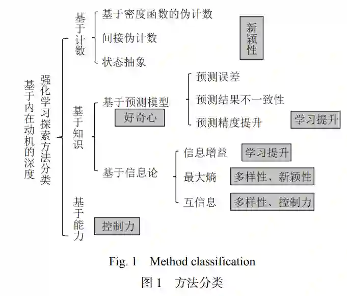 为解决大规模状态动作空间中由稀疏奖励、随 机噪声干扰等产生的探索困难问题, 研究者们提出 了基于目标、不确定性度量和内在动机等深度强化 学习探索方法[7-8] . 基于目标探索的方法通过对兴趣 状态进行分析来生成探索性子目标, 同时对如何到 达子目标的过程进行控制, 以提高智能体在复杂环 境中的探索效率. 这类方法偏规划, 重点在于存储状 态和轨迹信息, 并根据存储的信息规划生成子目标 点, 然后学习如何到达子目标点. 基于不确定性度量 的方法通常采用价值函数的贝叶斯后验来显示建模 认知不确定性, 或者采用分布式价值函数来额外评 估环境内在不确定性, 以鼓励智能体探索具有高度 认知不确定性的状态动作对, 并尽量避免访问具有 高度内在不确定性的区域. 该方法更多偏向于挖掘 价值函数中的不确定性, 体现的是计算思维. 与前 2 类方法相比, 本文所关注的基于内在动机 的方法从行为学和心理学中内在动机驱动高等生物 自主探索未知环境的机理出发, 将“新颖性”等多种 源自内在动机的启发式概念形式化为内在奖励信号, 以驱动智能体自主高效探索环境, 体现的是一种更 抽象和拟人的思维. 具体来说, 内在动机源于高等生 物在追求提高自主性和能力或掌控力的过程中获得 的愉悦感, 是驱动无外界刺激条件下探索未知环境 的动力. 内在动机在 DRL 中, 可以被映射为内在奖励 信号[23] , 与基于值函数或策略梯度的深度强化学习方 法相结合, 形成具备强启发性的探索策略, 以提高智 能体探索复杂未知环境的效率。 如何在内在奖励信号中形式化“新颖性”“好奇 心”“学习提升”“多样性”“控制力”等源自内在动机的启发式概念, 是设计基于内在动机的 DRL 探索方 法的关键内容. 根据内在奖励信号的不同启发式来 源并参考文献 [24] 中设想的各类基于内在动机的计 算框架, 本文将基于内在动机的深度强化学习探索 方法主要分为 3 类(见图 1): 基于计数的方法、基于 知识的方法和基于能力的方法.