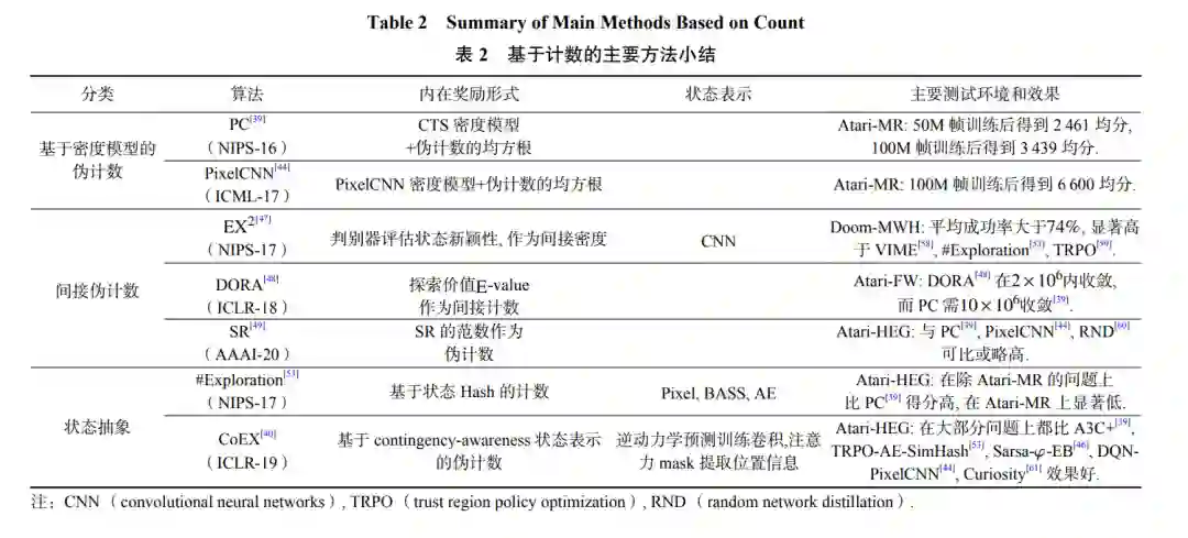 在高维连续环境中, 难以采用表格化的方式来 表示状态, 并且几乎没有任何 2 个观测状态完全相 同, 绝大多数状态的真实访问次数都不会超过 1 次, 直接采用经典探索理论方法中基于频率派或贝叶斯 派的方法, 得到的计数值无法有效衡量状态新颖性. 针对上述问题, 基于计数的方法一方面借鉴了 UCB 算法的思路, 继承了“面对不确定性的乐观”思想, 即 向访问次数较少的状态或状态动作对赋予更高的奖 励, 以鼓励智能体尽快探索状态空间的未知部分, 另 一方面采用基于相似性的状态泛化的解决思路. 该 类方法的实现途径包括伪计数方法[39] 和状态抽象方 法 [40] , 其中伪计数方法可细分为基于密度模型的伪计 数和间接伪计数方法。