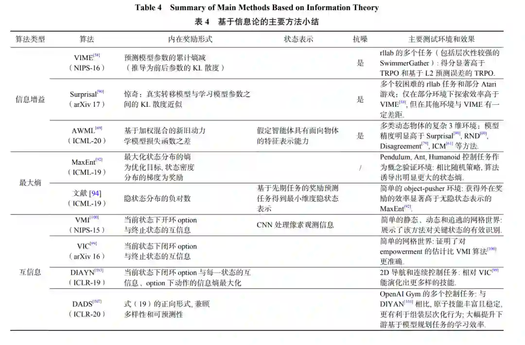 2.5 基于信息论的方法 信息论中以熵(entropy)为基础的一系列概念, 天 然地为衡量现实世界中的不确定性而生, 因此信息 度量也成为形式化启发式概念, 生成内在奖励的重 要工具[83] , 用于促进智能体高效探索未知区域.