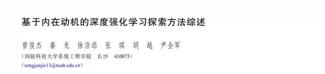 本文首先描述了 DRL 方法对高效率探索方法的 需求、经典方法的原理和局限性, 接着引入了内在动 机的概念和功能, 在此基础上重点梳理了内在动机 与 DRL 结合的不同形式. 它们主要包括: 1) 受新颖 性动机驱动的基于计数的内在奖励形式化; 2) 受好 奇心驱动的预测误差的奖励设计; 3) 受学习提升期 望驱动的精度提升和信息增益近似方法; 4) 以状态 多样性为启发式的最大熵方法; 5) 追求自主性和控 制力的互信息量化方法. 然后介绍了基于内在动机 的 DRL 探索技术在机器人运动、机械臂操作、空间 探索与导航等领域的应用情况. 最后深入分析了基 于内在动机的 DRL 探索方法在应用于贴近真实的复 杂场景时, 仍面临着难以构建有效的状态表示、环境 认知效率低、复杂目标/任务空间探索效果差等关键 问题, 并对基于内在动机的探索方法结合表示学习、 知识积累、奖励设计、目标空间探索、课程学习、多 智能体强化学习等领域方向开展研究进行了展望.