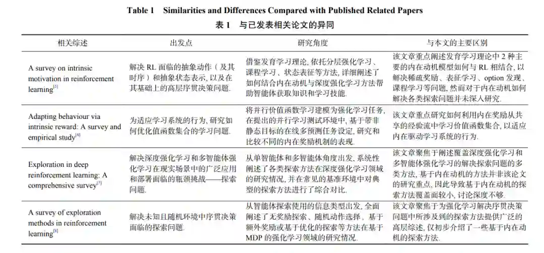 强化学习(reinforcement learning, RL)是监督学习、 无监督学习之外的另一机器学习范式, 通过设置反 映目标任务的奖励函数, 驱动智能体在与环境的交 互与试错中学习能使累计收益最大化的策略[1]。深度强化学习(deep reinforcement learning, DRL) 是在强化学习提供的最优决策能力的基础上, 结合 深度学习(deep learning, DL)强大的高维数据表征能 力来拟合价值函数或策略, 进而基于交互样本训练 得到最优价值函数或最优策略, 被认为是结合感知 智能和认知智能的有效方法. 深度强化学习在游戏人工智能、机器人、自然 语言处理、金融等诸多领域取得了超越人类的性能 表现[2-3] , 但在具备稀疏奖励、随机噪声等特性的环境 中, 难以通过随机探索方法获得包含有效奖励信息 的状态动作样本, 导致训练过程效率低下甚至无法 学习到有效策略[4] . 具体来说, 一方面现实应用中往往存在大量奖励信号十分稀疏甚至没有奖励的场景. 智能体在这类场景探索时需要执行一系列特定的动 作, 以到达少数特定的状态来获得奖励信号, 这使得 在初始时缺乏所处环境知识的智能体很难收集到有 意义的奖励信号来进行学习. 例如, 多自由度机械臂 在执行移动物体任务中, 需要通过系列复杂的位姿 控制将物体抓取并放置到指定位置, 才能获得奖励. 另一方面, 现实环境往往具有高度随机性, 存在意料 之外的无关环境要素(如白噪声等), 大大降低了智 能体的探索效率, 使其难以构建准确的环境模型来 学习有效策略. 例如, 部署应用在商场的服务机器人 在执行视觉导航任务时, 既要受到商场中大量的动 态广告图片或视频的传感干扰, 还可能面临动作执 行器与环境交互时的结果不确定性, 同时长距离的 导航任务也使其难以获得有效正奖励信号. 因此深 度强化学习领域亟需解决探索困难问题, 这对提高 DRL 的策略性能和训练效率都十分重要.针对奖励稀疏、随机噪声等引起的探索困难问 题, 研究者们提出了基于目标、不确定性度量、模仿 学习等探索方法, 但对任务指标的提升效果有限, 并 增加了额外的数据获取的代价. 近年来, 源自心理学 的内在动机(intrinsic motivation)概念因对人类发育 过程的合理解释, 逐渐被广泛应用在 DRL 的奖励设 计中以解决探索问题, 成为了 ICML, ICLR, NeurIPS, ICRA 等顶级学术会议上的热点方向, 受到来自清华、 斯坦福、牛津、谷歌等顶级高校与研究机构的关注. 虽然已有文献[5-8] 介绍内在动机在深度强化学习领域 的研究现状, 但据我们所知, 尚没有文献全面深入研 究各类基于内在动机的 DRL 探索方法, 并逐步深入 讨论其应用于贴近真实世界的复杂动态场景中所面 临的关键问题以及未来的发展方向. 我们从出发点、 研究角度分析了相关综述文献与本文的主要区别, 如表 1 所示. 基于上文梳理的深度强化学习面临的探索困难 问题, 本文首先介绍 3 种经典探索方法以及它们在高 维或连续场景下的局限性, 接着全面梳理 3 类不同的 基于内在动机的 DRL 探索方法的基本原理、优势和 缺陷, 随后介绍上述基于内在动机的方法在不同领 域的应用情况, 最后总结亟需解决的关键问题以及 发展方向.