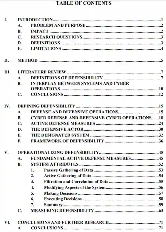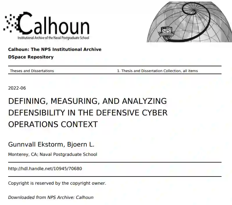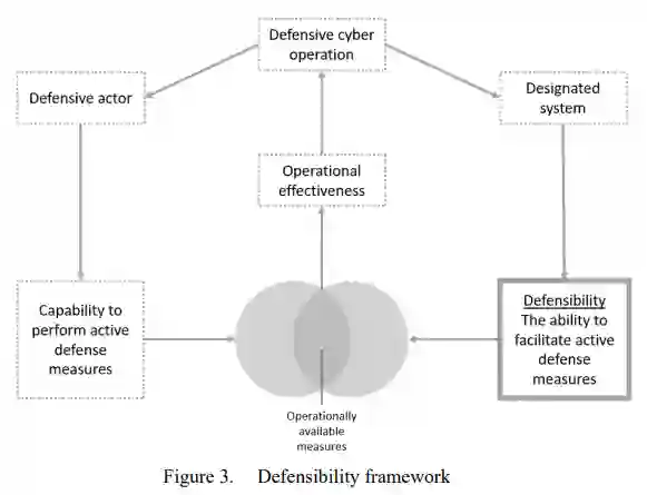 在谈论网络系统时,研究人员和决策者都广泛使用 "可防御性(defensibility)"一词,但没有一个普遍的定义,也没有观察和衡量它的方法。本研究探讨了在防御性网络战背景下如何定义可防御性,哪些关键因素构成了可防御性,以及如何衡量这些因素。为此,首先研究了学说和研究,为可防御性建立了一个意义框架。其次,该研究提出了防御者在防御性网络战中需要具备的七种基本能力,以及一套影响这些能力的系统属性。最后,提出了一套对这些属性的测量方法,以使可防御性得到观察和测量。这项研究的结果是对防御性网络战背景下的防御性的定义,构成其防御性的系统属性列表,以及对这些属性的一套相关测量。利用这些,可以分析一个系统的可防御性,以表明防御者在系统中进行操作时可能有哪些限制,以及系统需要改进的地方。这项工作是将可防御性建设成一个有用的工具的第一步,它强调了在系统中进行动态防御行动的防御者的需求,而不是实施静态措施以提高网络安全的行为者的需求。