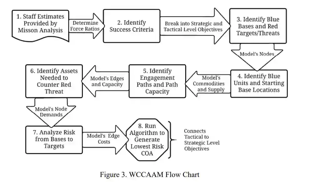 美国空军研究介绍了兵棋推演多物网络行动路线自动分析方法(WCCAAM),这是一种通过军事决策过程(MDMP)的半自动化协助兵棋指挥官制定和分析行动路线(COA)的新方法。MDMP是一种七步迭代方法,指挥官和任务合作伙伴可以遵循该方法建立作战行动方案,以实现战略目标。MDMP需要时间、资源和协调——指挥官权衡所有竞争项目以做出最佳决策。WCCAAM接收MDMP的任务分析阶段作为输入,将兵棋推演转换为有向图,在节点和边上处理多物网络流算法,其中物品代表单位,节点代表蓝色基地和红色威胁,然后编程处理MDMP步骤以输出推荐的COA。为了证明WCCAAM的有效性,兵棋推演场景比较了模拟、集成和建模高级框架(AFSIM)和统计分析中的COA结果。AFSIM结果表明,与人工生成的COA相比,WCCAAM COA的客观完成度提高了71%。统计分析表明,在超过300次运行的测试矩阵中,WCCAAM生成了最佳的、风险最小的 COA。