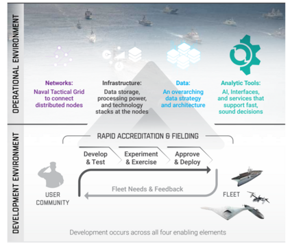 无人系统通过解除对有人系统的限制来提供实现任务结果的能力。仅靠搭建平台是无法实现任务成果的。为了在无人空间提供整体解决方案,DON 将更加关注开发成功扩展投资经验所需的推动力。其中一些关键推动因素包括:网络、控制系统、基础设施、接口、人工智能和数据。海军和海军陆战队正在设计和实施一个全面的作战架构来支持 DMO。这种架构将为单位、作战群和舰队提供准确、及时、分析的信息。