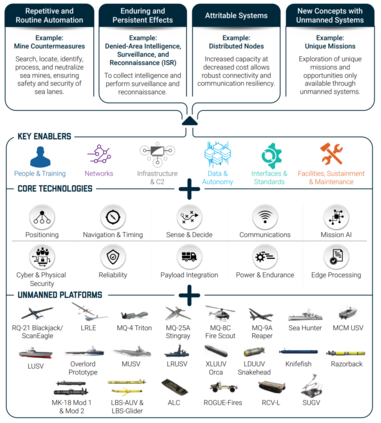 美国、盟国和敌方部队获得无人驾驶技术的速度要求有一个愿景和路线图来最大化这种能力。海军陆战队需要无人驾驶的空中、水面和地面系统来充分利用固有的远征性质和能力。与海军伙伴合作,将提供一个联合部队的海上组成部分指挥部,在居住的独特海域支持联合部队。当在恶劣的条件下以小队形式在前方作战时,最大限度地利用无人系统为盟友和对手创造巨大的效果的能力是未来成功的一个关键因素。