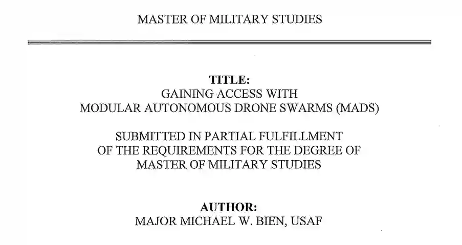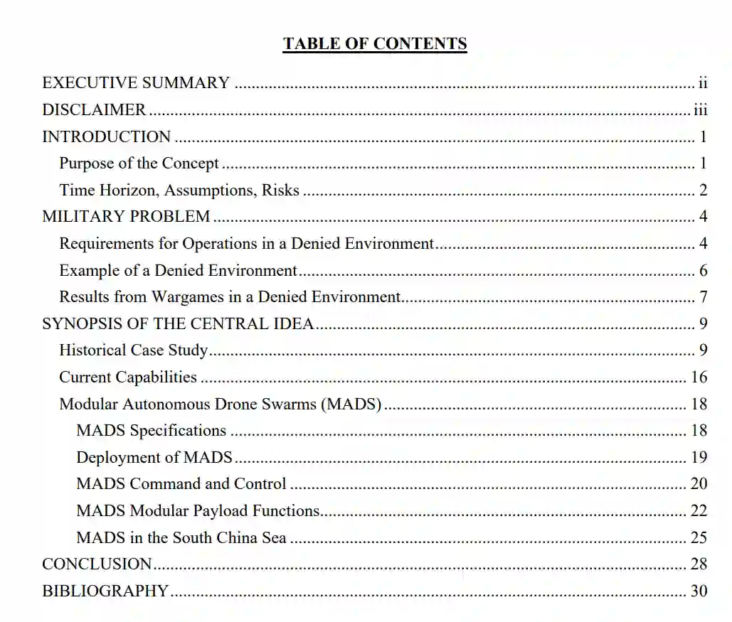 本概念文件旨在研究模块化自主无人机蜂群(MADS)的开发和使用,可为海军陆战队提供在同级对手的 IADS 中开展行动所需的远程能力。凭借在复杂的 IADS 中的机动自由,海军陆战队可以获得态势感知,并创造机会利用电子战和网络战加强作战。如果不能保持这种态势感知能力,尤其是在偏远地区,海军陆战队就会面临不必要的风险,难以圆满完成任务要求。
