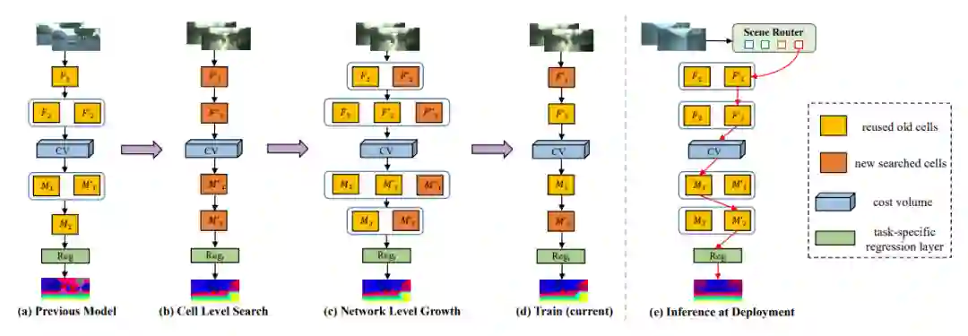 深度双目模型在驾驶场景中取得了最先进的性能,但在未见过的场景中进行测试时性能严重下降。尽管最近的工作通过不断的在线适应缩小了这一性能差距,但这种设置需要在部署时不断更新梯度,并且无法避免灾难性的遗忘。为了应对这些挑战,我们建议执行连续双目匹配,其中模型的任务是 1) 不断学习新场景,2) 克服忘记先前学习的场景,以及 3) 在没有在线梯度更新的情况下连续预测视差。我们通过引入可重用架构增长 (RAG) 框架来实现这一目标。RAG 利用特定任务的神经单元搜索和架构增长来持续学习新场景。在增长过程中,它可以通过重用之前的神经单元来保持高可重用性,同时获得良好的性能。还引入了一个名为 Scene Router 的模块,以在推理时自适应地选择特定于场景的架构路径。实验结果表明,我们的方法在各种具有挑战性的驾驶场景中都优于最先进的方法。