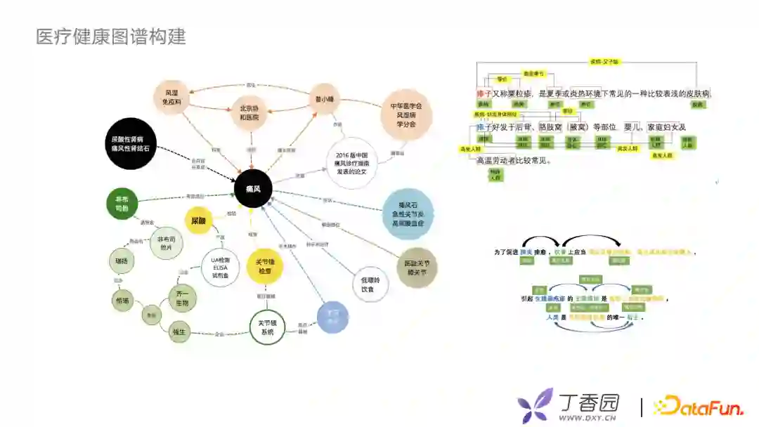 首先介绍一下丁香园应用到的医疗健康图谱。医疗健康图谱构建由专业的医疗团队来维护,有医学背景相关同事维护疾病、症状、手术、药品等医学概念以及60多种医学关系。同时,丁香园nlp组会用一些算法去抽取和意图分类等工作,利用算法与人工相结合的方式对实体、关系、实体属性进行扩充。因为丁香园业务模式较多,需要考虑在图谱应用上如何做迁移、融合工作。
