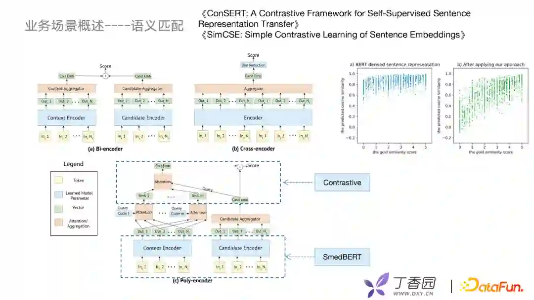 我们在Poly Encoder之上做了一些改进,例如把SMedBERT引入到表示层,并且引入对比学习的优化,比较经典的是ConSERT和SimCSE,例如美团去年提到的一个对比学习的方法,实际应用中在计算句子相似度的时候会有很高的打分。这样虽然可以获得想要的内容,但在召回时不好控制召回的数量,误差也比较大。加入对比学习后会发现可以更好地解决BERT坍缩问题。 未来挑战主要有三个方面: