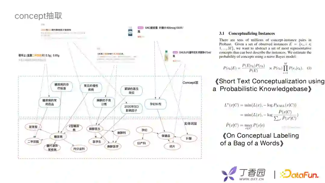 利用concept层次联合底层的专业医学实体和上层的业务,构建一个完整的业务图谱。以贝叶斯模型为基础去判断一对一的边关系,考虑全局的统计量或者文本的局部特征,生成一些多边的关系。我们借鉴了王仲远老师的一些相关工作,如MDL的原则等去做concept筛选。例如,论坛帖子、药物、商品信息等可以通过中间的concept层与实体之间进行关联。