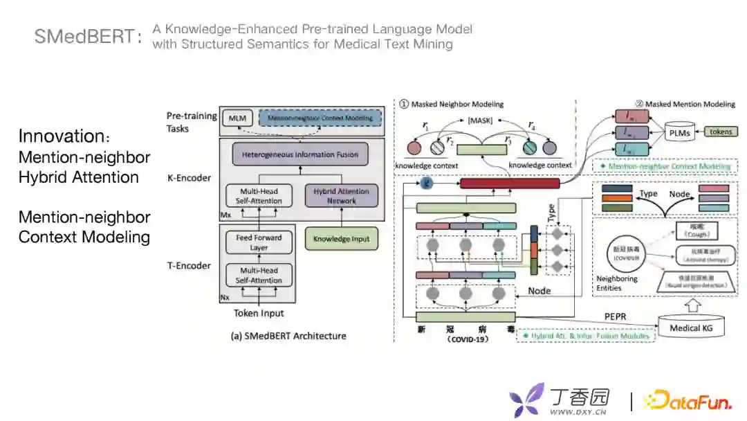 首先是Mention-neighbor Hybrid Attention用来学习捕捉异构实体信息。什么是异构实体信息?图谱中有一个新冠病毒节点,与它相关的节点有疾病症状、治疗方案、检测方法等。将与新冠病毒节点一跳的相关实体取出,根据type和节点node信息融合到encoder层。 第二个创新点是Mention-neighbor Context Modeling,主要是将链接实体的上下文信息做mask处理去预测。模型主要由三个模块组成T-Encoder、K-Encoder、Pre-training Tasks。首先T-Encoder可以挑选出比较重要的相邻实体,使用方法是类似于PageRank的一种方式。其次K-Encoder进行mask操作,self attention获得关键实体的信息,对mask任务进行融合。