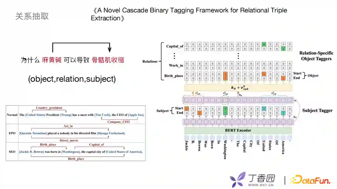 图谱构建中肯定涉及关系抽取工作,早期关系抽取采用pipeline的方式进行,先做实体识别再做关系分类。但是,pipeline的方式可能会造成实体识别错误,间接会导致关系抽取也出现问题。借鉴了《A Novel Cascade Binary Tagging Framework for Relational Triple Extraction》文章联合学习的方式,实现二分标注的框架。该框架对object、relation、subject 做函数映射,而不像以前地方式去做离散的标签。它分为两个模块subject Tagger和 relation-specific object Taggers:subject Tagger先使用一个二分类去识别出subject的起始位置和结束位置,拿到subject去做表示特征,然后根据关系做一个多分类任务。每一个关系,都是一个二分类识别。根据映射得到object起始位置和结束位置,这样以一种联合的方式拿到实体关系三元组。