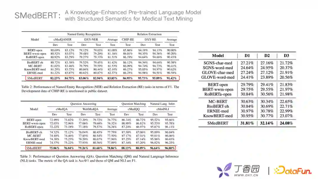 D1、D2、D3,主要对不同程度的邻实体覆盖进行划分。如D2使用了高频重合的实体,D3是低频实体去做比较。实验表明SMedBert对具有结构信息的捕捉能力较强。最终我们得到一个结论,将相邻相似实体、相关实体的信息引入到语义信息中,在下游任务上可以得到很明显的提升,其中留下了我们的一些思考:我们现在选择的邻居实体都是在一跳或者是两跳以内的,如果有"farther neighboring"远端的实体关系该如何应用?未来可以考虑如何更好地从长尾低频的医学实体学习语义信息。
