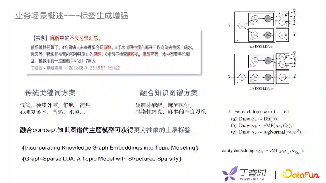 我们利用concept结构图谱对文本结构化上做了一些提升。文本结构化对于提升搜索效果起到了非常重要的作用,有了concept之后可以帮助我们从抽象的层面完成对文本打标签的工作,那业界中比较好的方案就是先用TransE之类的知识表示模型,把知识图谱train出Embedding,然后将这些embedding融合进LDA的模型里面,在模型中,会用vMF分布代替原来的高斯分布去处理实体词的部分。如此以来,我们就会对一篇如“麻醉不良习惯”的帖子中的讨论帖子抽出如“麻醉医学”和“麻醉的不良习惯”这样的关键词。